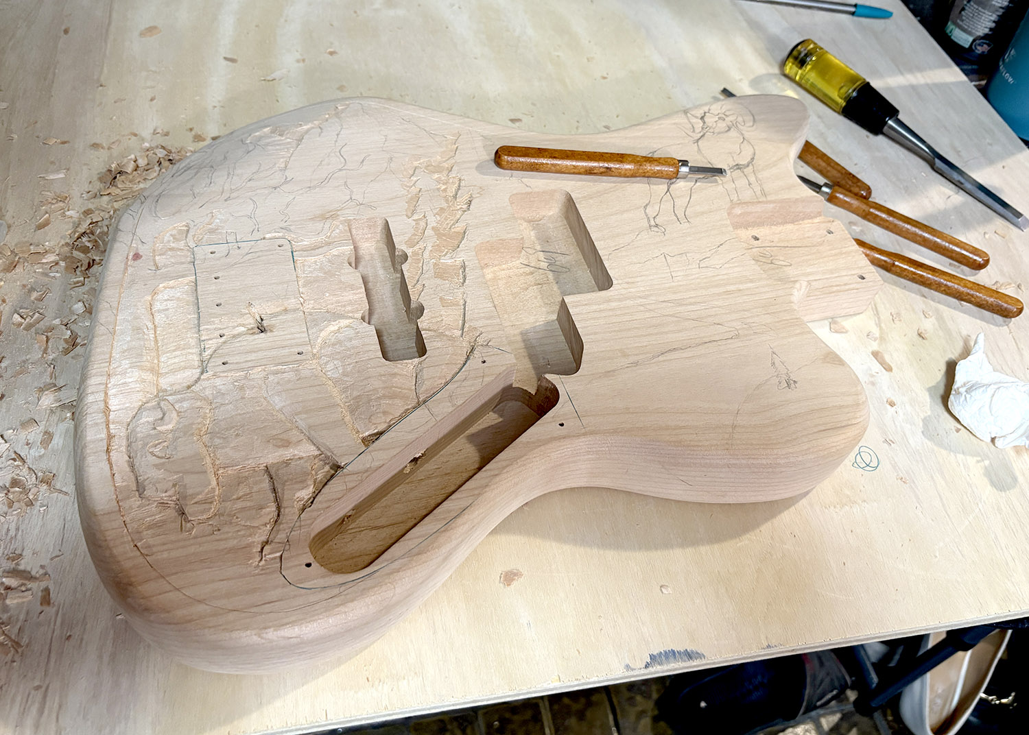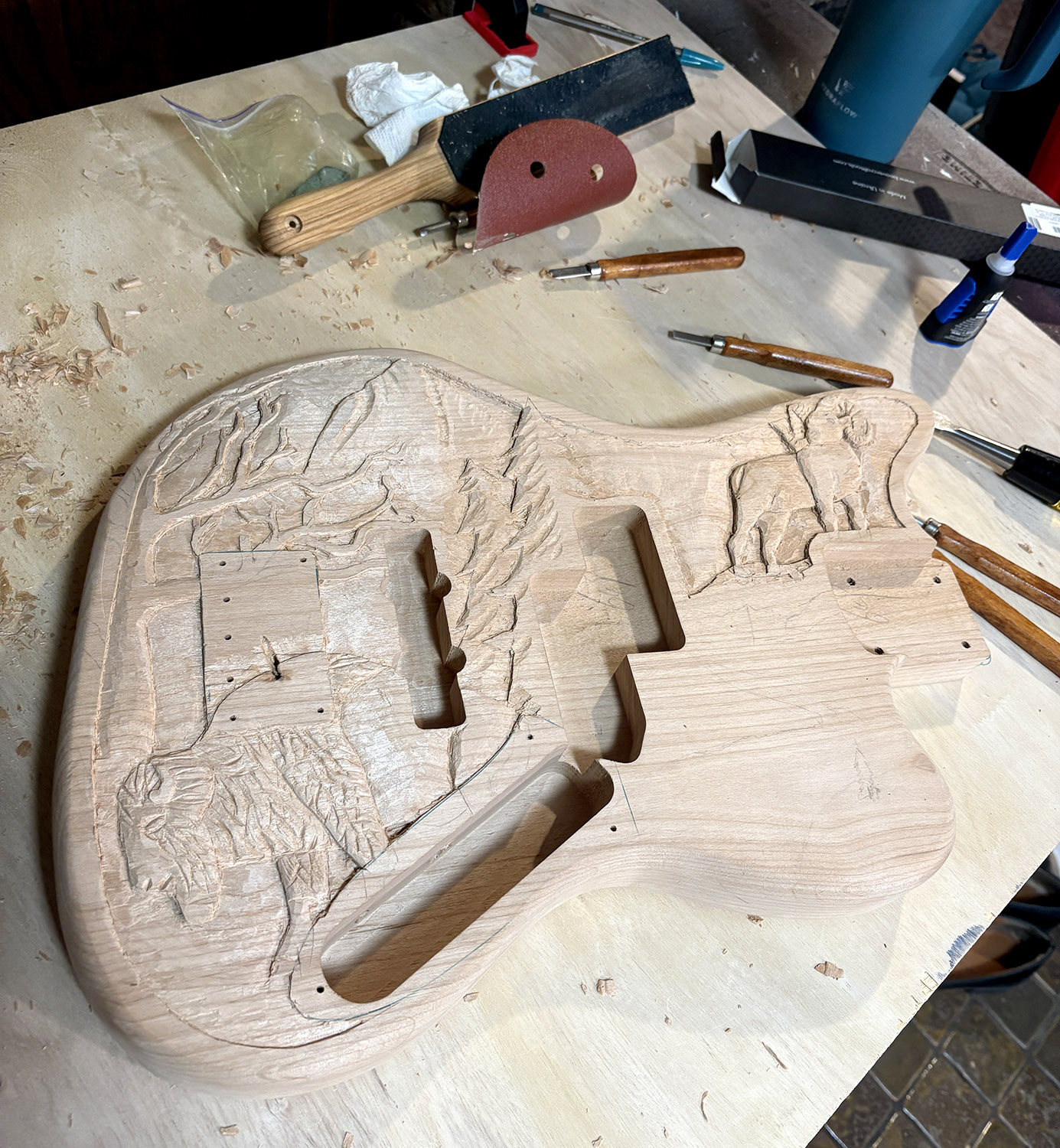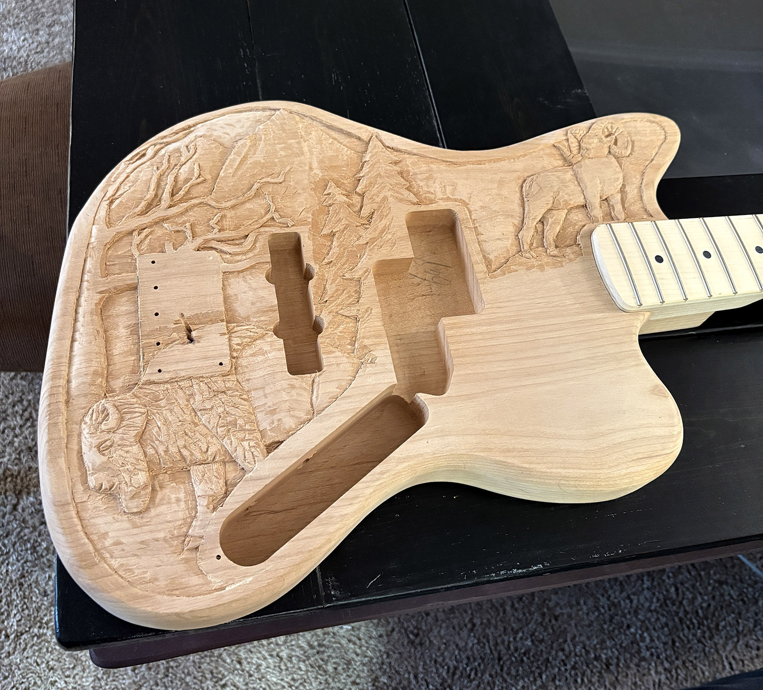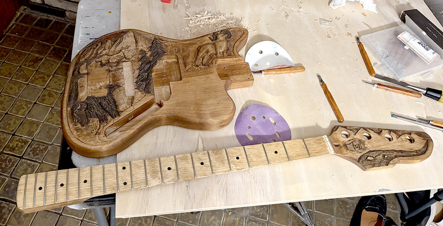It was definitely slow going at first. I feel like my creativity has really been waning in recent years which made it difficult for my brain to guide my hand. I traced the lines with a sharp chisel, but removing material didn’t feel the same as the last guitar I did. Before, it would feel like I was removing layers and revealing the sculpture below. This time around, it felt more like I was just going through the motions and hoping everything would come out ok. It made the whole process frustrating because I was a lot more worried that the carving wasn’t going to work out or reveal itself to me.