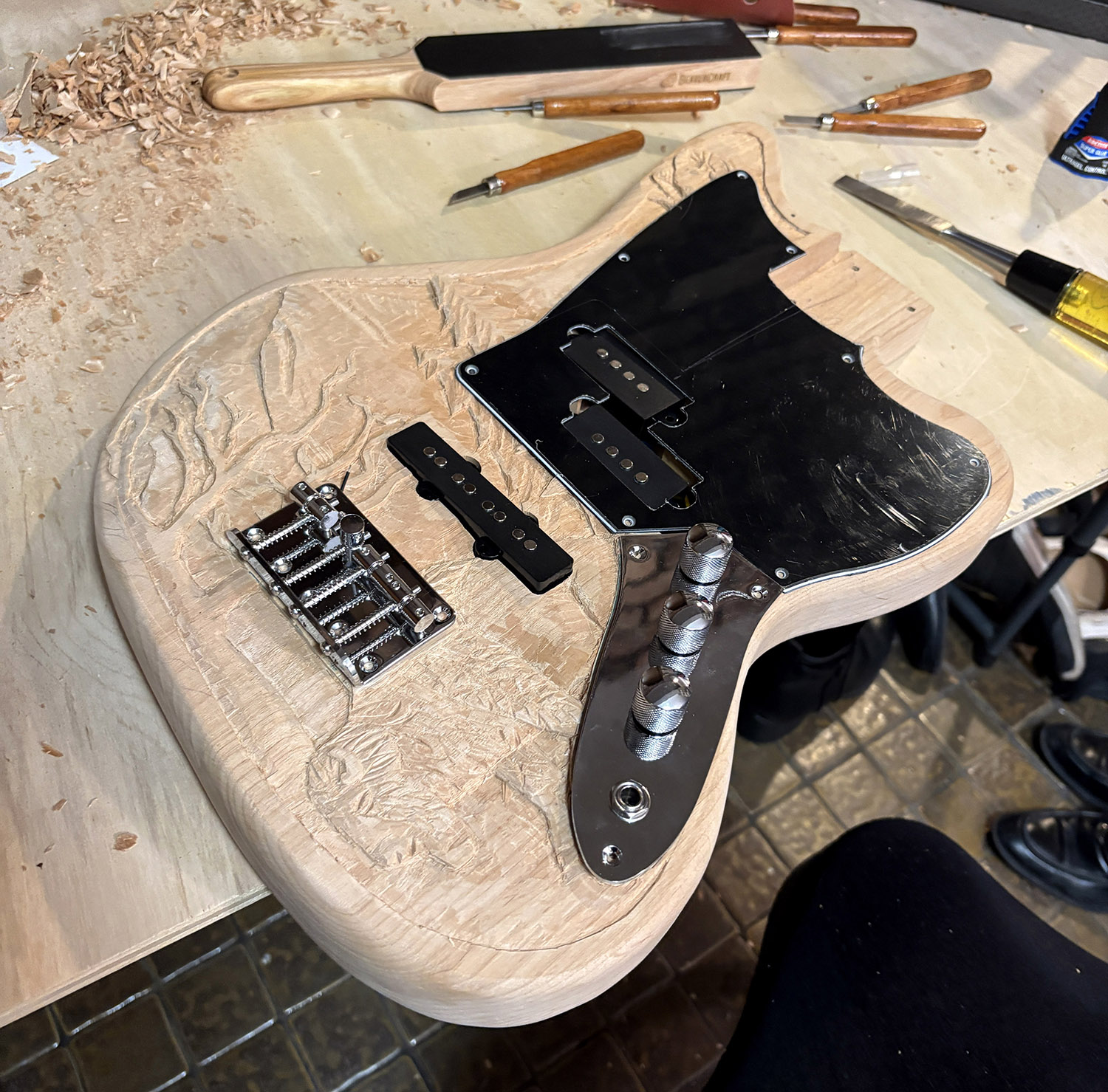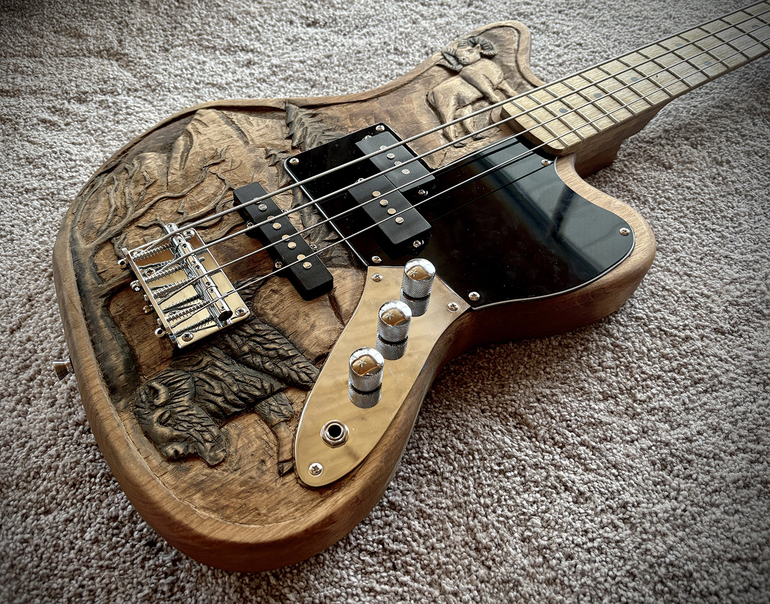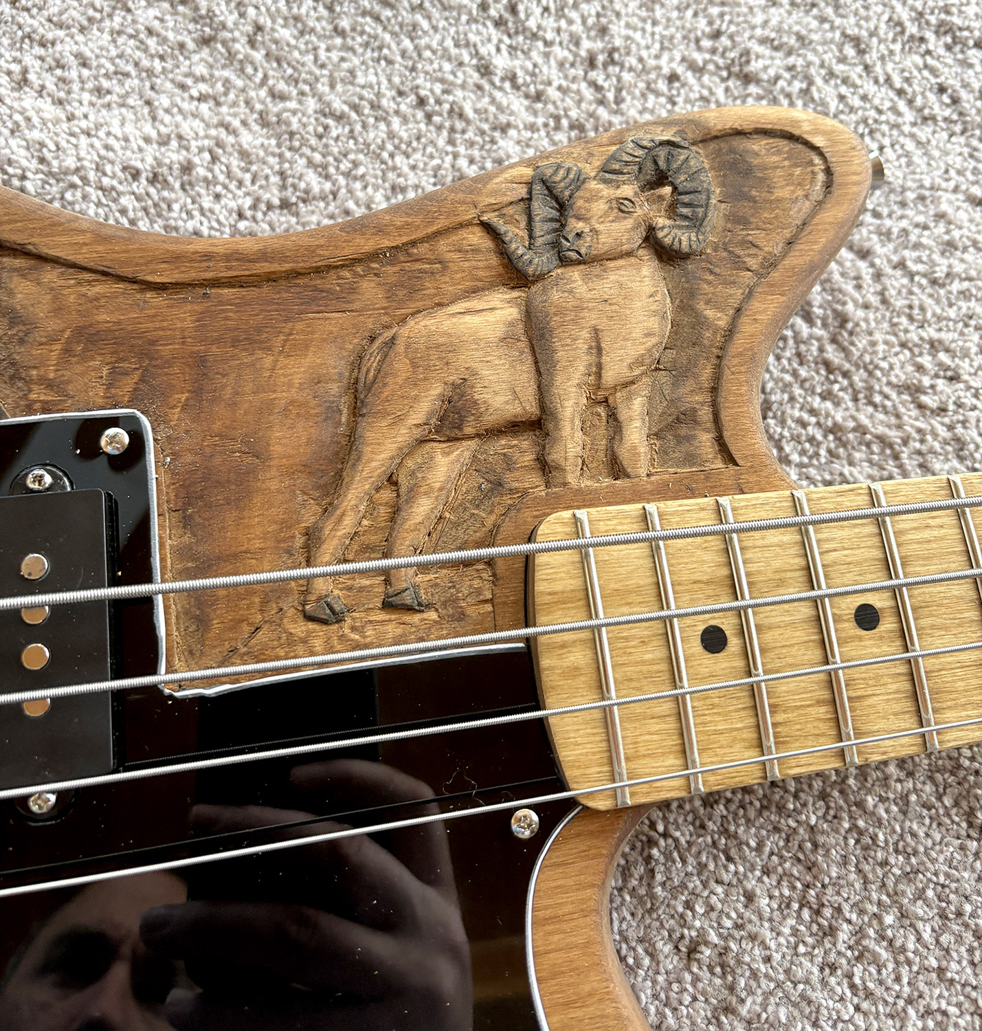 It was definitely slow going at first. I feel like my creativity has really been waning in recent years which made it difficult for my brain to guide my hand. I traced the lines with a sharp chisel, but removing material didn’t feel the same as the last guitar I did. Before, it would feel like I was removing layers and revealing the sculpture below. This time around, it felt more like I was just going through the motions and hoping everything would come out ok. It made the whole process frustrating because I was a lot more worried that the carving wasn’t going to work out or reveal itself to me.